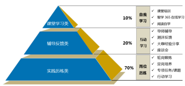 按照“721 学习法则”(70%的经验和技能来自实践; 20%从其他人身上获得; 10% 来自课堂培训) ,通过课题培训、轮岗锻炼、挑战性任务、一对一辅导、在线学习、 读书计划、职称获取等多种方式开展培养,以期达到“训战结合,力求实效,助力 成长”的培养效果。