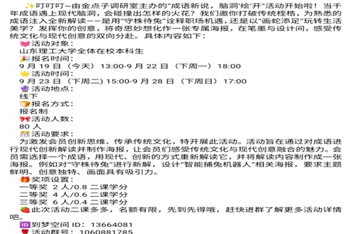 此次“成语新说,脑洞绘开”活动由金点子调研室社团主持操办,同学们通过线上投稿的方式进行比赛,报名时间为9月19日至9月22日,活动时间为9月23日至9月28日。在活动举办前,管理学院金点子调研室社团积极宣传,通过多种途径在校园中广泛宣传,吸引了大量同学积极踊跃地参与此次活动。