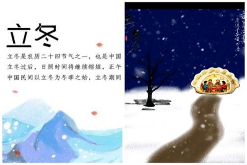 参赛者们以小组智慧创作了包含冬日雪景、饺子、冬日祝福等元素的明信片,用文字与图画传递了真挚的情感,让传统节气的文化韵味在创新中焕发了生机。而以小组形式制作明信片能够提高参赛者们的小组合作能力,领导能力,组织能力等,借助“立冬”这一节气也增强了同学们的文化自信。