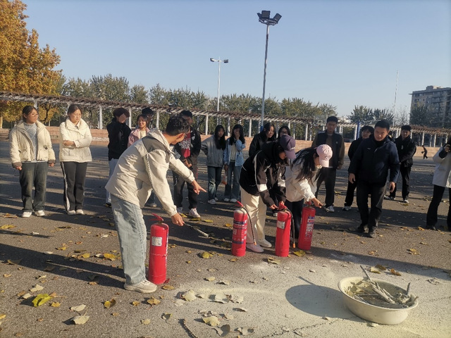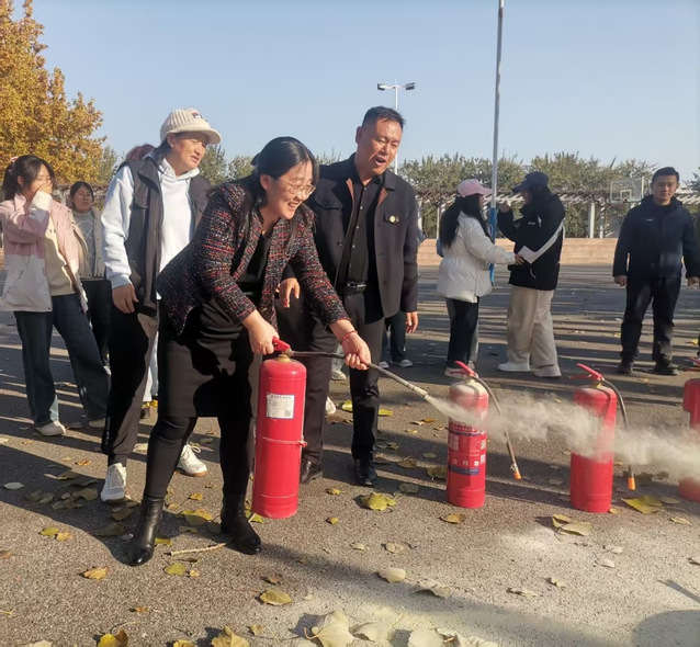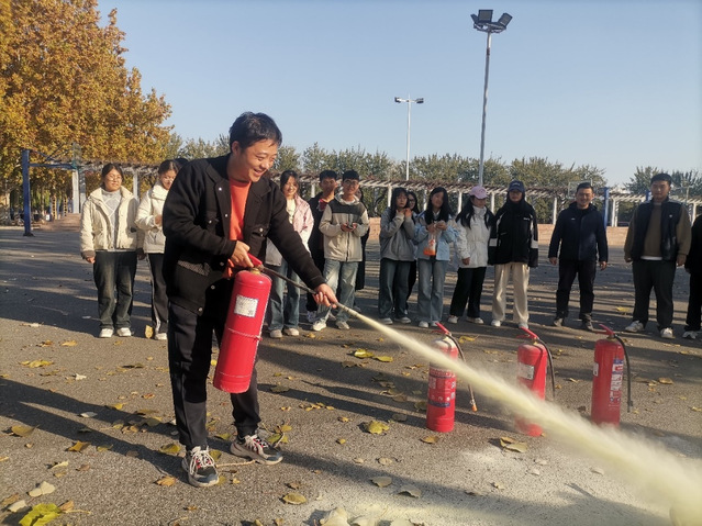演练前,王希鹏强调了消防演练的重要性和必要性,要求大家掌握基本消防技能增强安全防范能力。接着,学校安全保卫处专业消防人员就如何预防火灾,如何应对火灾,如何以正确的方式逃离火灾现场三个方面进行了培训,随后详细讲解了手提式干粉灭火器的基本构造、使用步骤和注意事项,并指导师生进行灭火器的操作。