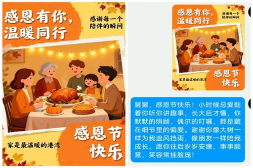 此次感恩节贺卡活动,不仅为同学们提供了一个展示创意、锻炼能力的平台,更是一堂生动的感恩教育实践课。它引导同学们学会发现爱、感受爱、表达爱,在创作与传递的过程中,深刻体悟亲情的珍贵与感恩的力量,进一步推动了和谐家庭、和谐校园的构建。