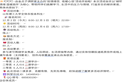 此次“投情绪信,收暖心语”活动由金点子调研室社团主持操办,同学们通过实体信箱投递纸质信件或线上填写表单的方式参与活动。活动报名时间为12月2日至12月3日,活动时间为12月4日至12月6日。在活动举办前,管理学院金点子调研室社团积极宣传,通过多种途径在校园中广泛宣传,吸引了大量同学积极踊跃地参与此次活动。