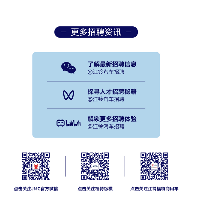 江铃汽车招聘微信公众号:微信搜索【江铃汽车招聘】
