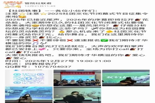2025年12月27日晚,管理学院社团文化节闭幕式晚会在东校四教二楼报告厅顺利举行,本次活动由学院学生社团指导中心主办,各社团积极参与,众多师生到场观演,为本届社团文化节画上圆满句号。