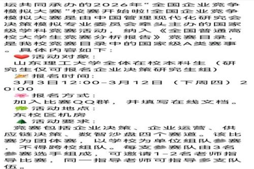 为搭建学科实践平台,锤炼学生企业运营与决策能力,金点子调研室承办2026年全国企业竞争模拟大赛校赛,赛事面向全校本科生开启报名通道,提供国家级A类学科竞赛的校内角逐机会。此次赛事为《全国普通高校大学生竞赛分析报告》竞赛目录收录赛事,是检验学生管理专业知识应用能力、培养团队协作素养的重要实践载体。