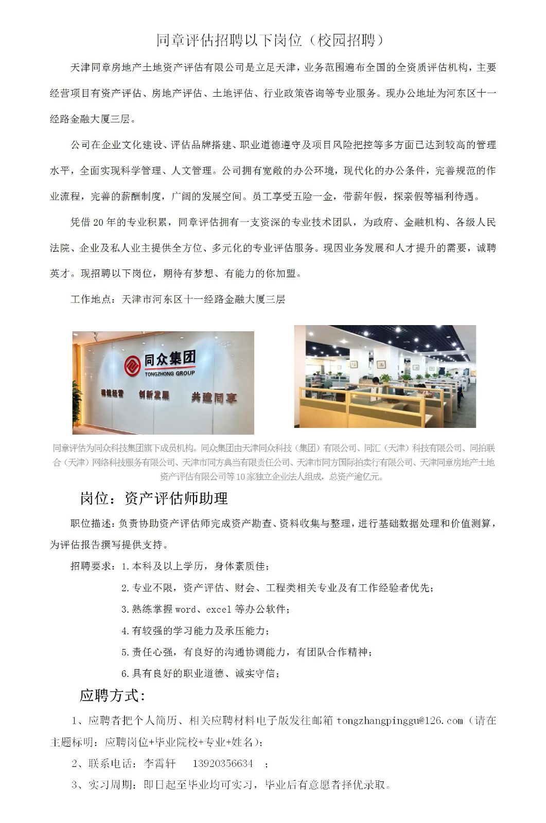 天津同章房地产土地资产评估有限公司是立足天津,业务范围遍布全国的全资质评估机构,主要经营项目有资产评估、房地产评估、土地评估、行业政策咨询等专业服务。现办公地址为河东区十一经路金融大厦三层。 公司在企业文化建设、评估品牌搭建、职业道德遵守及项目风险把控等多方面已达到较高的管理水平,全面实现科学管理、人文管理。公司拥有宽敞的办公环境,现代化的办公条件,完善规范的作业流程,统一的员工服装,完善的薪酬制度,广阔的发展空间。员工享受五险一金,带薪年假,探亲假等福利待遇。 凭借20年的专业积累,同章评估拥有一支资深的专业技术团队,为政府、金融机构、各级人民法院、企业及私人业主提供全方位、多元化的专业评估服务。现因业务发展和人才提升的需要,诚聘英才。现招聘以下岗位,期待有梦想、有能力的你加盟。 工作地点:河东区、滨海新区