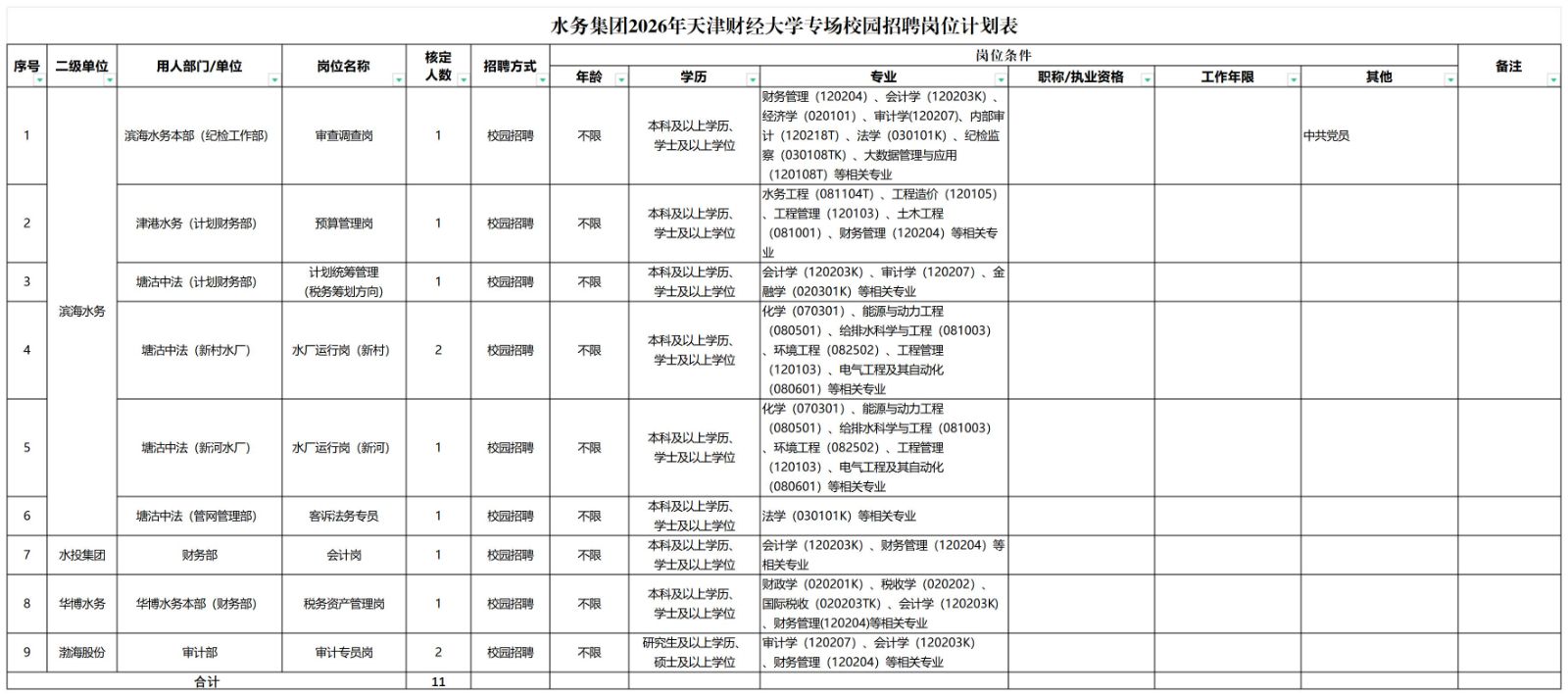 招聘具体条件见《水务集团2026年天津财经大学校园招聘岗位计划表》(附件1)