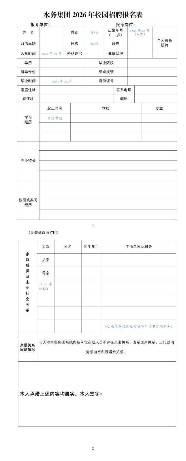 3.报名材料包括:《水务集团2026年校园招聘报名表》(附件2)、在校成绩(加盖学校印章)、在校期间获奖证明及其他材料。