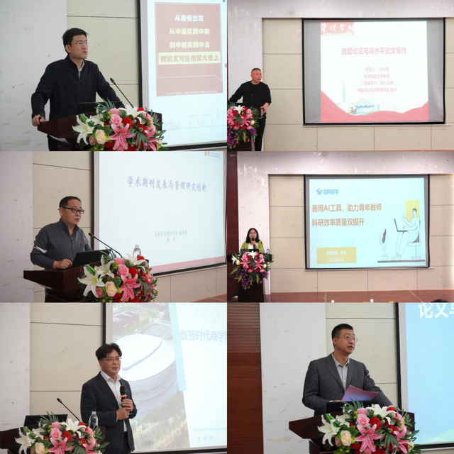 在主题报告环节,天津财经大学副校长、《现代财经》主编陈旭东作了题为《智库建设与咨政报告写作》的主题报告,《管理学刊》执行主编张跃胜作了题为《选题论证与高水平论文写作》的主题报告,《南开管理评论》编辑部主任周轩作了题为《学术期刊发表与管理研究创新》的主题报告,同方知网数字科技有限公司研学平台运营总监李宁作了题为《善用AI工具,助力青年教师科研效率质量双提升》的主题报告,天津理工大学管理学院院长王京滨作了题为《数智时代商学院高质量发展与国际认证》的主题报告。