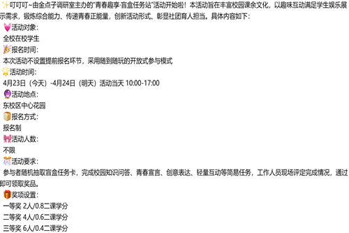 此次“青春趣享・盲盒任务站”活动,以新颖有趣的形式丰富了同学们的周末课余生活,为校园增添了轻松活泼的青春气息。未来,本社团将持续立足校园生活,推出更多形式多样、趣味十足的互动活动,不断为同学们搭建展示自我、放松身心的平台,让校园生活更加多彩充实。